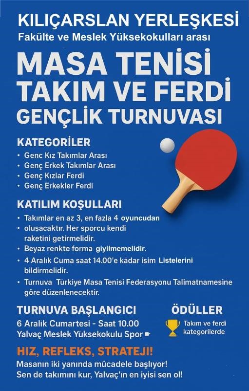 Kılıçarslan Yerleşkesi masa tenisi gençlik turnuvası kayıtları başladı